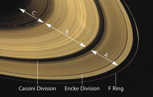 It was years later when other observers started theorizing that Saturn’s bizarre appearance was due to a ring surrounding it. Christiaan Huygens was the first to suggest that Saturn was surrounded by a ring actually detached from the planet. Twenty years later, in 1675, Giovanni Domenico Cassini determined that Saturn’s ring was actually rings and that there were gaps between them. The rings are named alphabetically in the order of their discovery. The largest gap is between A Ring and B Ring spanning 4800 km (about 3000 miles) in width! It was discovered by Cassini himself and, therefore, was named the Cassini Division.