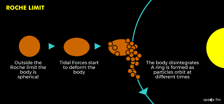 A quick reminder that the Roche limit is the distance at which a large object is so close to a planet that the planet’s tidal force pulls it apart. I talked a bit more about the Roche limit and ring formations in my previous post.