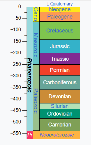 Geologic periods are part of the geologic time scale. This is a representation of time which scientists divide based on Earth’s rock record. Basically, when time passes sedimentary and volcanic rock layers deposit on top of each other. Our planet is 4.5 billion years old, so that is a lot of deposition.