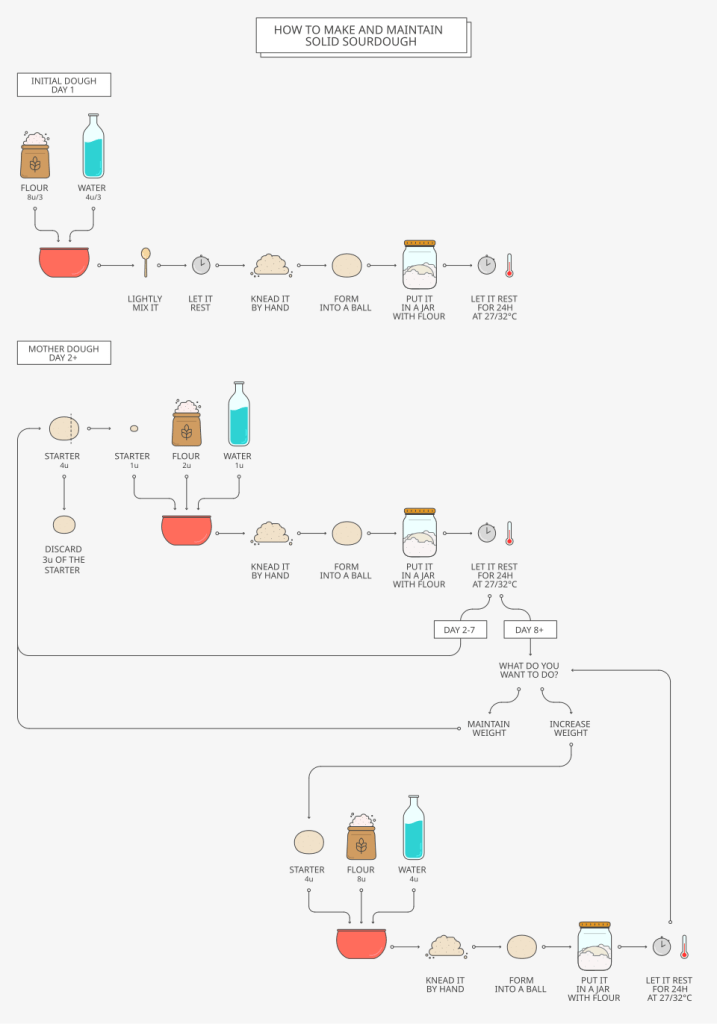 Flour naturally contains a variety of yeasts and bacteria. When it comes in contact with water, a chemical process occurs, breaking down the starch into glucose and maltose, which yeasts feed on. The periodic addition of more flour and water, called ‘refreshment’ or referred to as ‘feeding’, leads to a healthy and stable culture, which can go on for years.