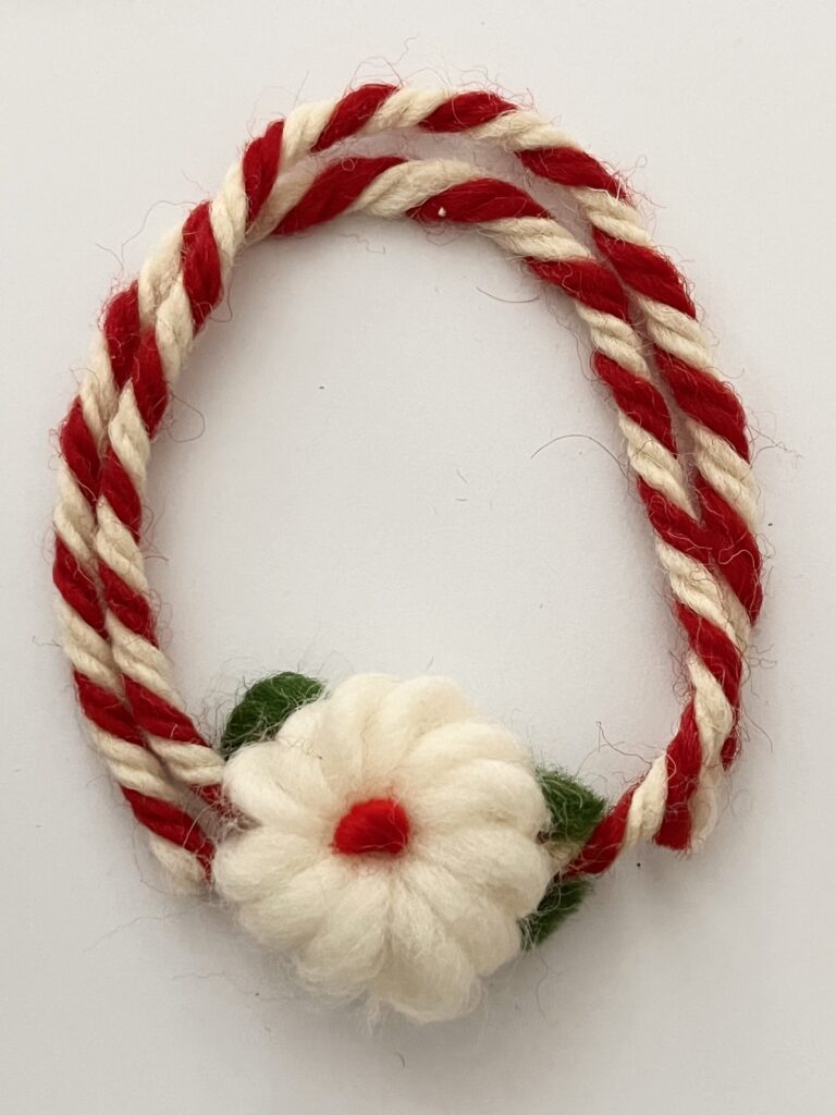They’re called martenitsi and are associated with the month of March – in Bulgarian “mart” (март). Martenitsi are a traditional ornament that people gift to one another and wear during the month of March. They symbolize the ending of winter and the coming of spring. Martenitsi come in many shapes, but mostly they are a braid of a white and red thread in the form of a bracelet or a brooch, often additionally decorated.